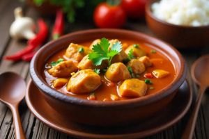 A spicy chicken stew served with rice, blending bold flavors for a comforting Bhutanese meal.
