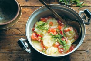 Comforting potatoes cooked with cheese and chilies, creating a mildly spicy yet hearty Bhutanese classic.